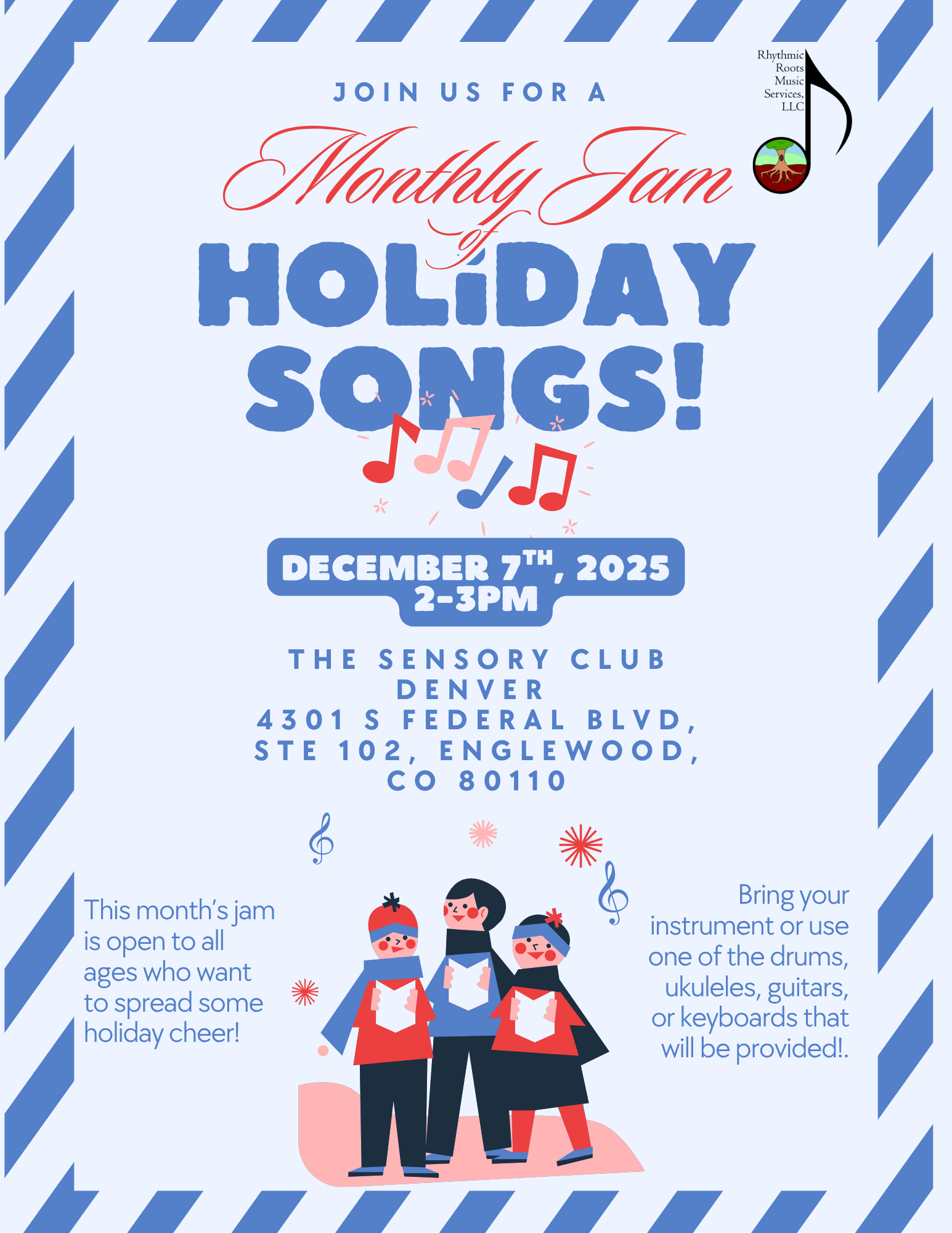[Image description: Flyer for the December monthly jam with the business's logo in the upper right hand corner. There is a group of carolers singing as well as music notes above them. The blue and red text reads, "Join us for a Monthly Jam Holiday Song! December 7th, 2025 2-3pm The Sensory Club Denver 4301 S. Federal Blvd, Ste 102, Englewood CO 80110 This monthly jam is open to all ages who want to spread some holiday cheer! Bring your instrument or use one of the drums, ukuleles, guitars, or keyboards that will be provided!"]